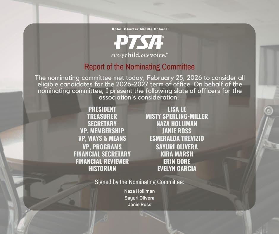 2026-2027 PTSA Board Nominations Please visit www.nobelptsa.org for more information. https://www.nobelptsa.org